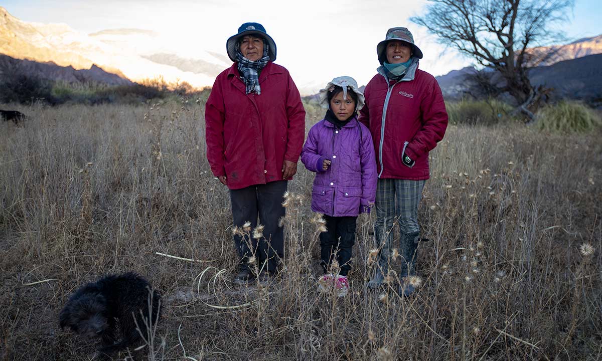 Rosita, su madre y su hija cruzan un puente improvisado sobre el río Toro. Viven en la Quebrada del Toro. Volviendo del campo, una crecida repentina arrastró al padre de Rosita en 2024. No es el único fallecido por los aludes.