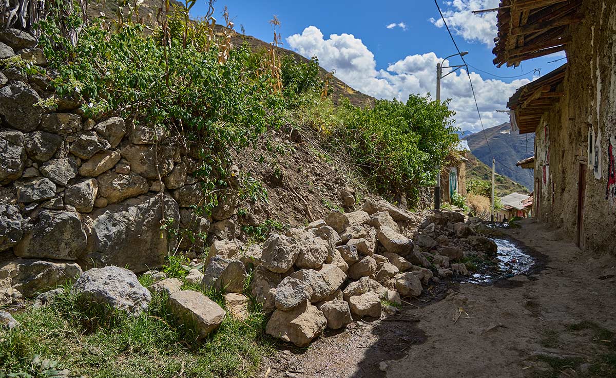 El escenario es distinto en la entrada al pueblo. Ahí desaparecen los muros, el suelo ya no es afirmado ni hay demarcaciones. Y así, como cualquier sendero de herradura, el Camino Inca continúa hasta el Centro Poblado de Castillo, unos diez kilómetros en descenso.